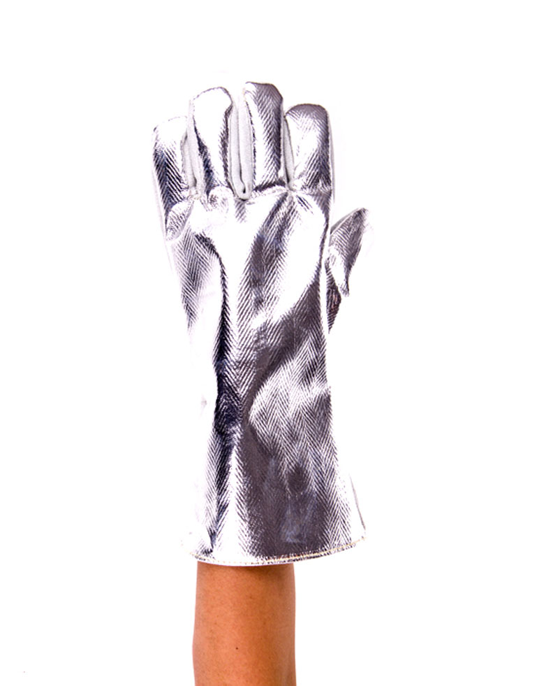 4. ถุงมืออลูมิไนซ์ (Aluminized Gloves) มักนิยมใช้ในงานเชื่อม เตาไฟ และโรงหล่อ หลอมโลหะ เพราะ สามารถที่จะสะท้อนและ เป็นฉนวนป้องกันความ ร้อน โดยถุงมืออะลูมิไนซ์ จะเสริมด้วยวัสดุสังเคราะห์ (Synthetic Materials) ซึ่งมี คุณสมบัติต้านทานความ ร้อนและความเย็น